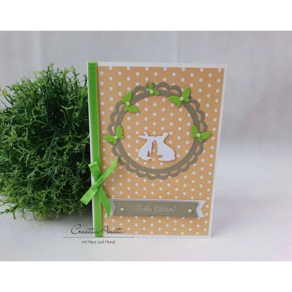 Tolles Designpapier mit Pünktchen in Apricot. Hier drauf wurden verschiedene frühlingshafte oder österliche Stanzteile platziert.