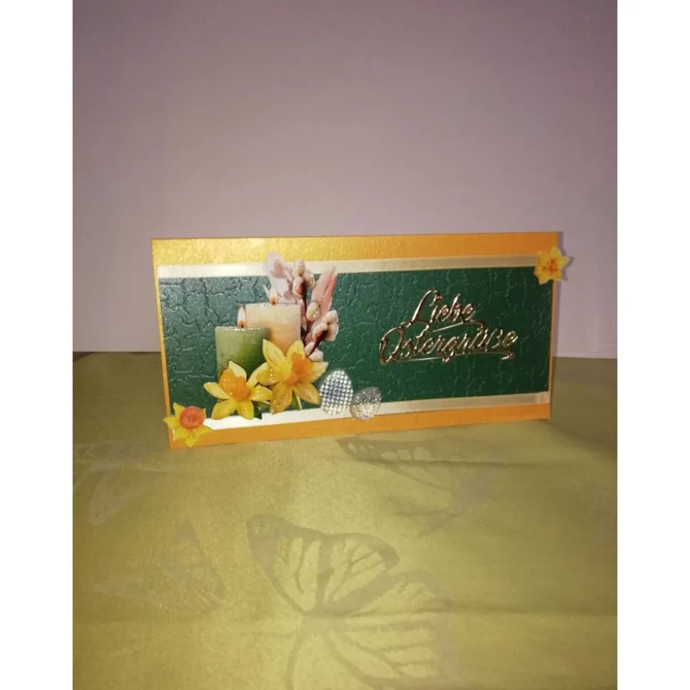 Mit einem Stanzer und dem Stanzmotiv habe ich aus einem goldenen Spiegelkarton den Spruch: Liebe Ostergrüße ausgestantzt und auch an der Karte angebracht.