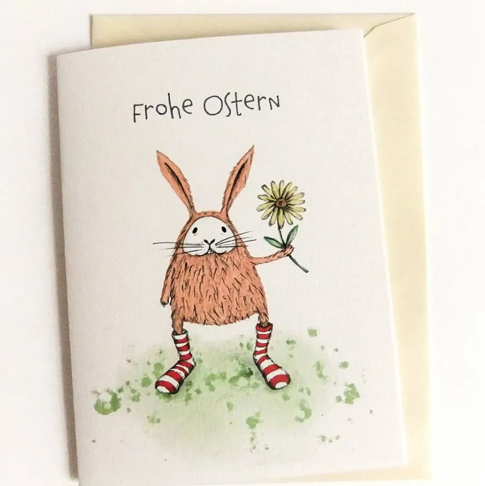 Hase in geringelten Socken mit Schriftzug ‚Frohe Ostern‘
