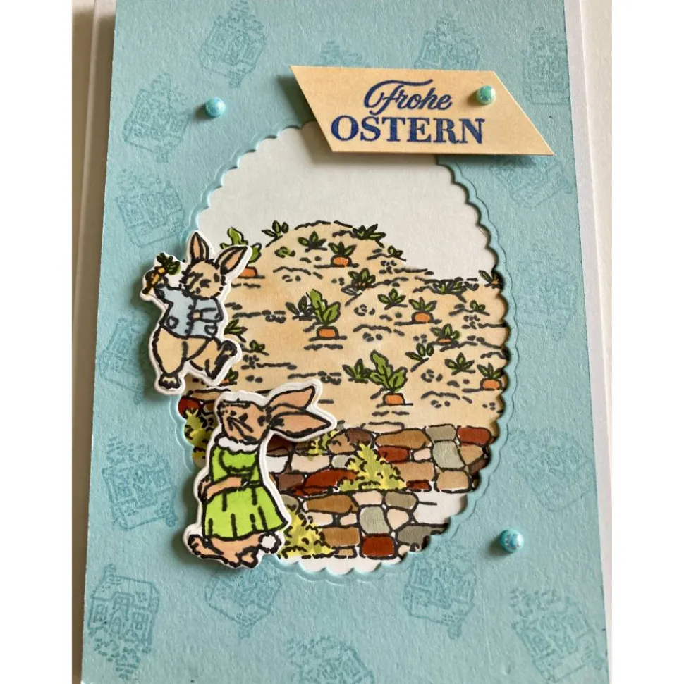 Der blaue Aufleger und die zwei Hasen wurden mit Abstandshalter auf die Karte geklebt, so das ein 3D Effekt entstanden ist.