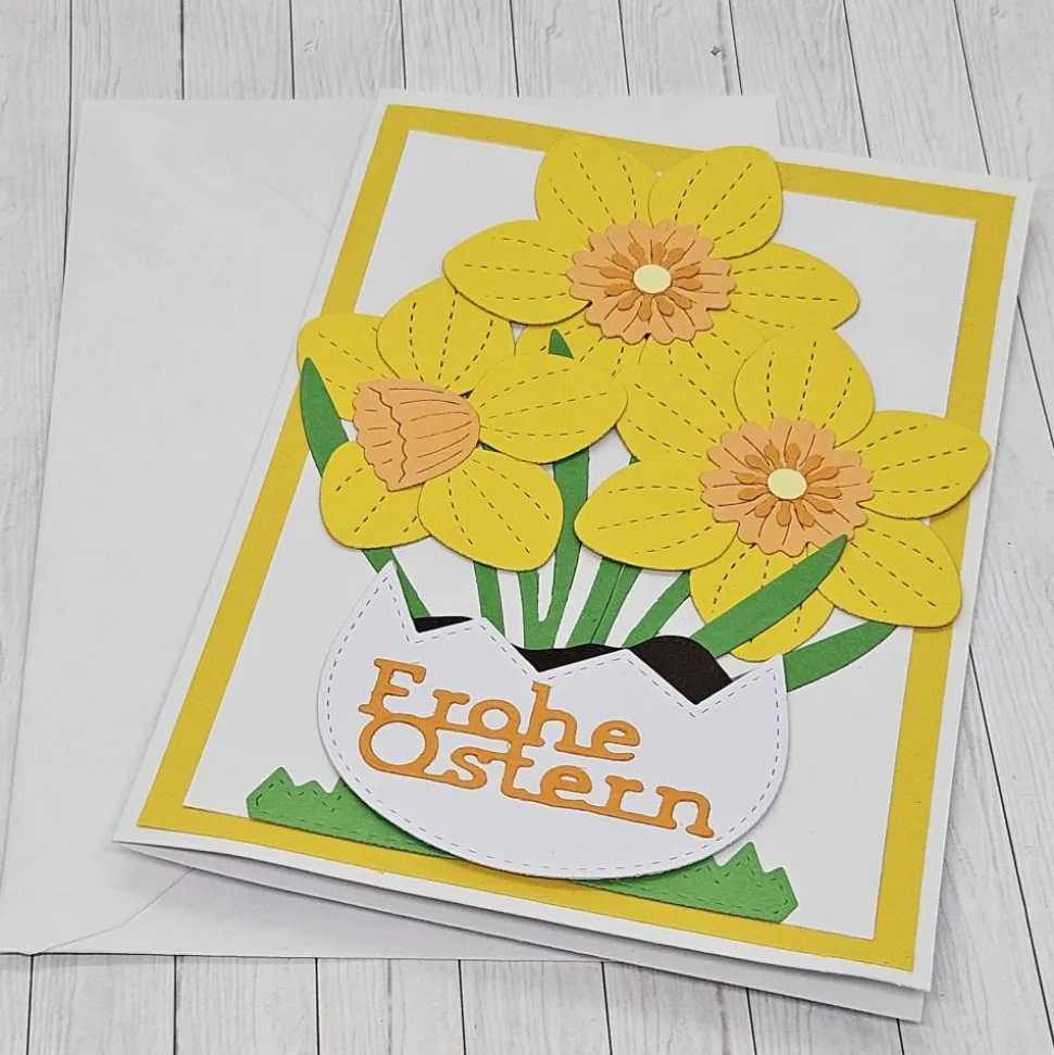 Ostern und Narzissen gehören einfach zusammen! Mit dieser liebevoll gestalteten Osterkarte bringst du den Frühling direkt ins Haus. Leuchtend gelbe Osterglocken in einer Eierschale sorgen für gute Laune und machen deine Ostergrüße zu etwas ganz Besonderem!