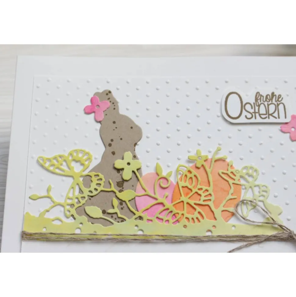 Den Schriftzug „Frohe Ostern“ habe ich gestempelt, ausgeschnitten und mit Abstandspads aufgeklebt.