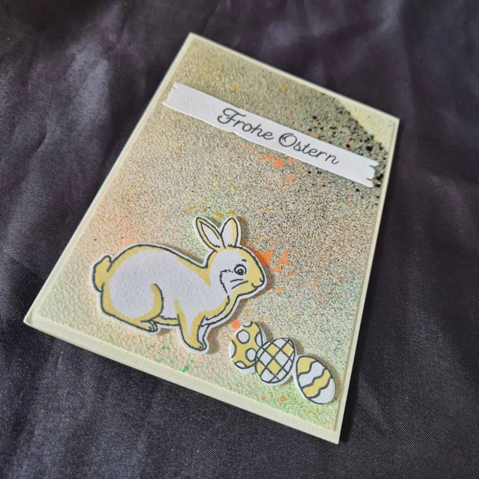 Entdecke unsere liebevoll gestaltete Osterkarte mit einem niedlichen Osterhasenmotiv und dem herzlichen Spruch ‚Frohe Ostern‘.