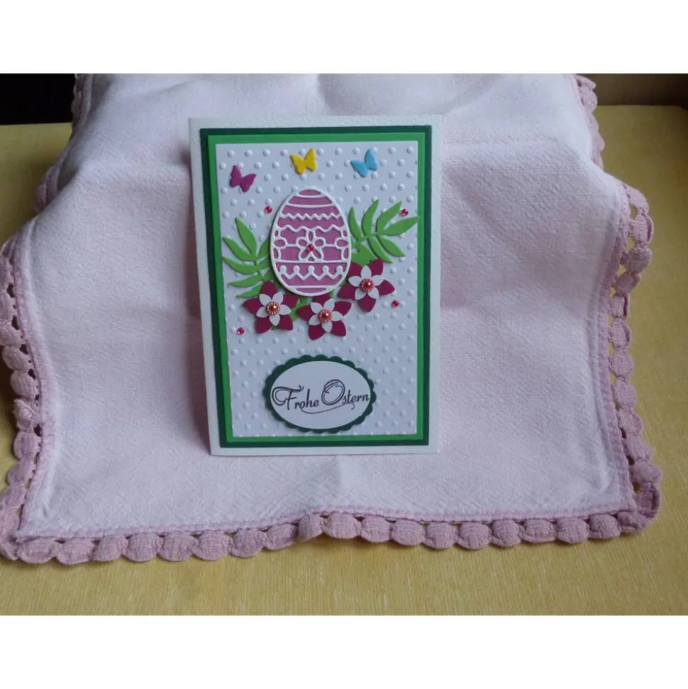 verziert ist die Karte mit Zweigen,Blumen,Schmetterlinge,Ei,Straßsteinchen