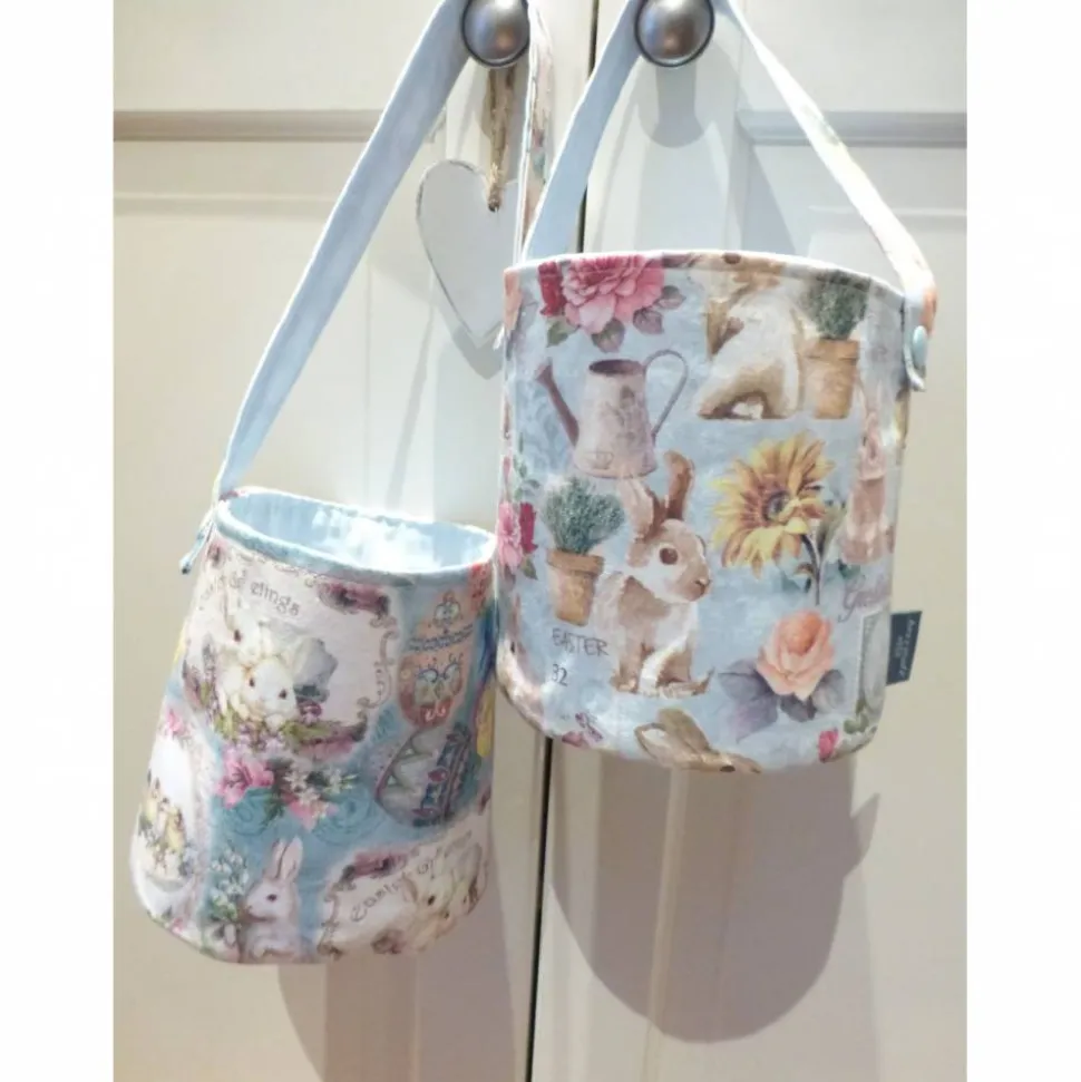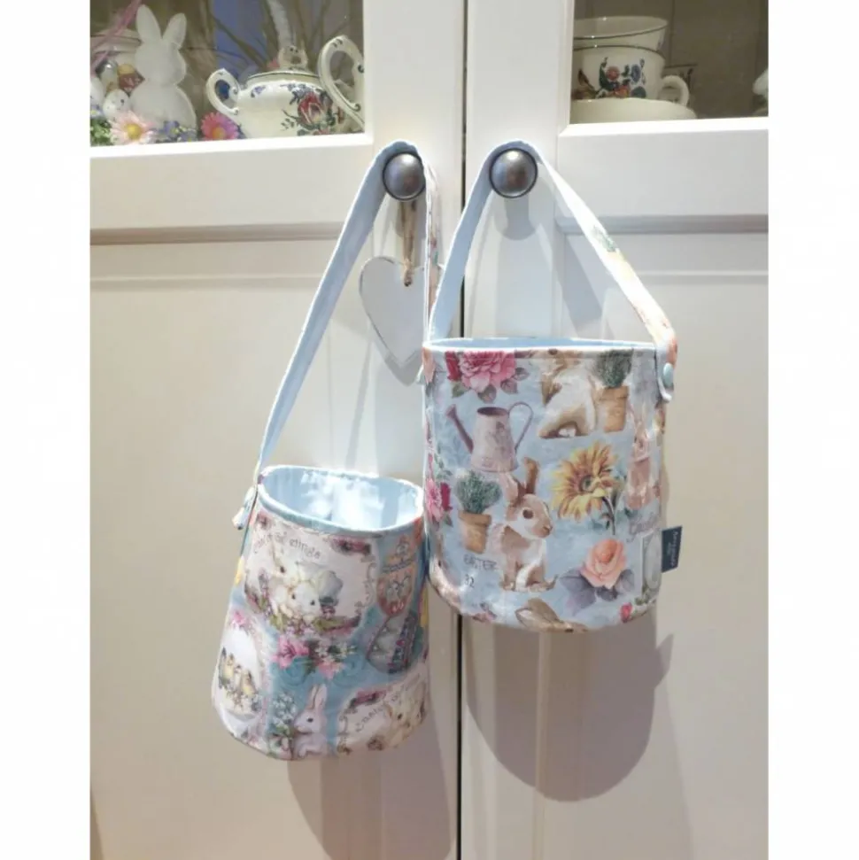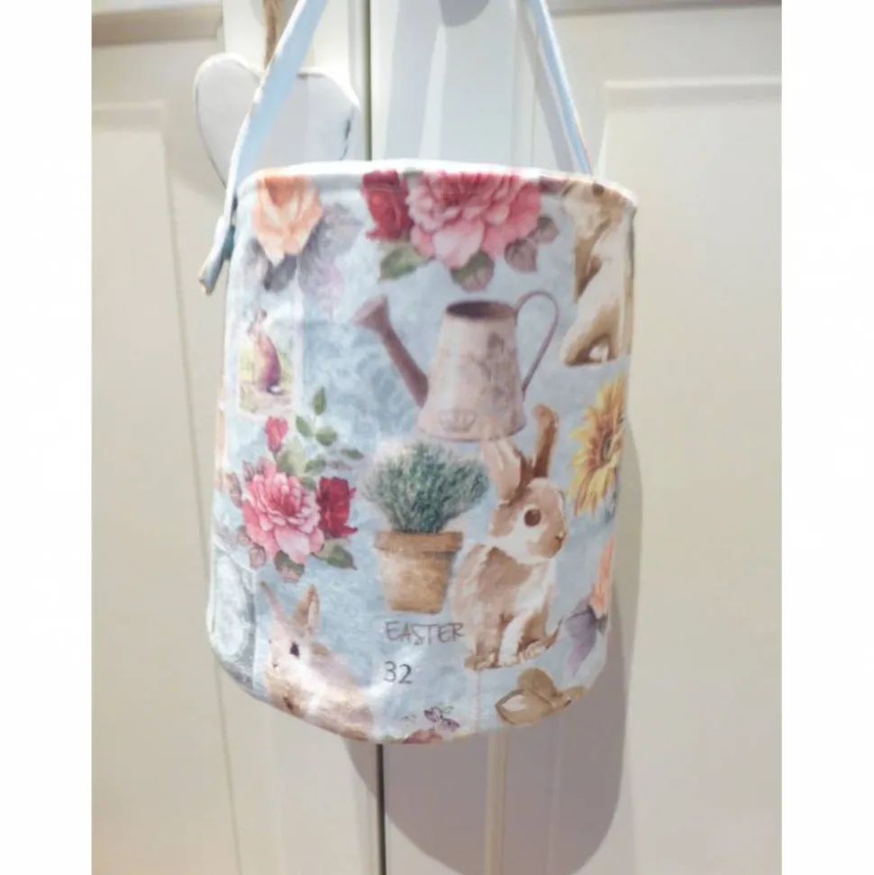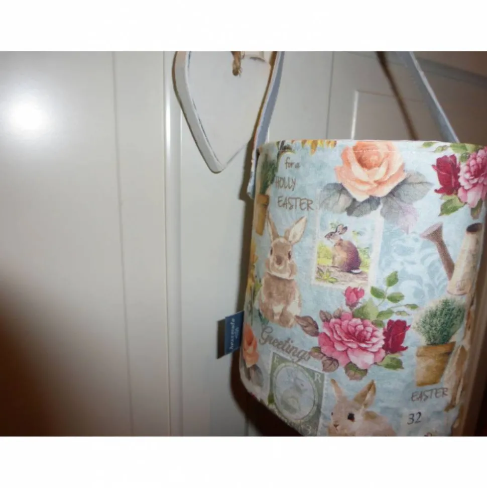 Wunderschöner Stoff mit Hasen, Blumen, Lavendel und Gießkanne wurde hier zu einem Osterkörbchen vernäht.