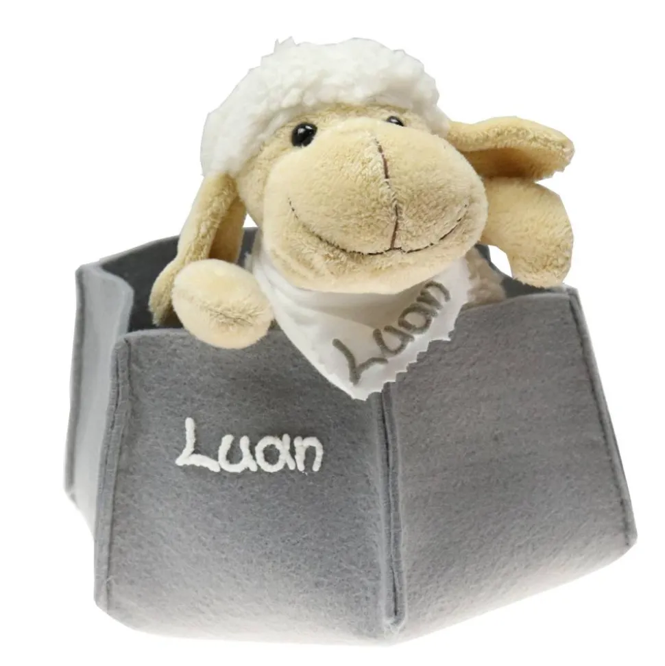 Ein tolles Ostergeschenk für große und kleine Kinder. Ein Osternest zum Befüllen und ein niedliches Schaf, der genauso wie das Filzkörbchen mit dem Namen des Kindes beschriftet wird.