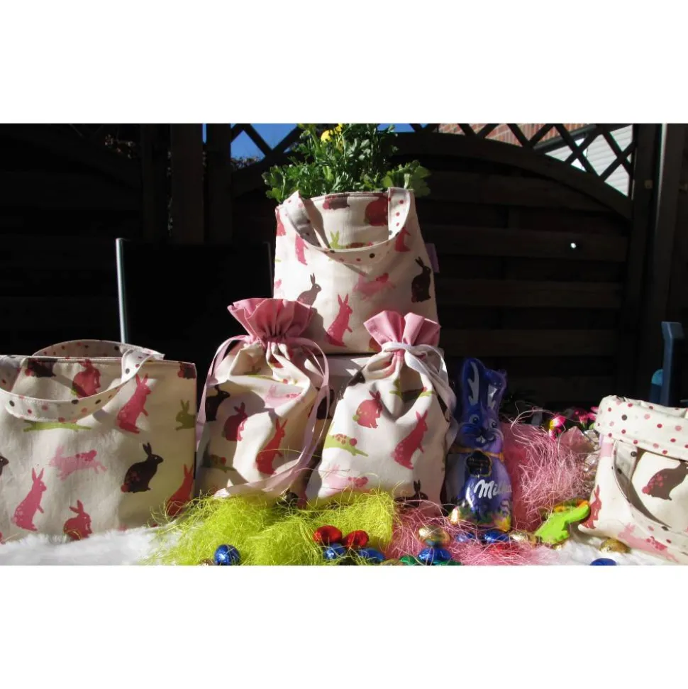 Auf dem Außenstoff von „Westfalenstoffe“ hoppeln Häschen in unterschiedlichen Farben , der passende Innenstoff von „Westfalenstoffe“ hat Pünktchen in den Farben der Häschen.