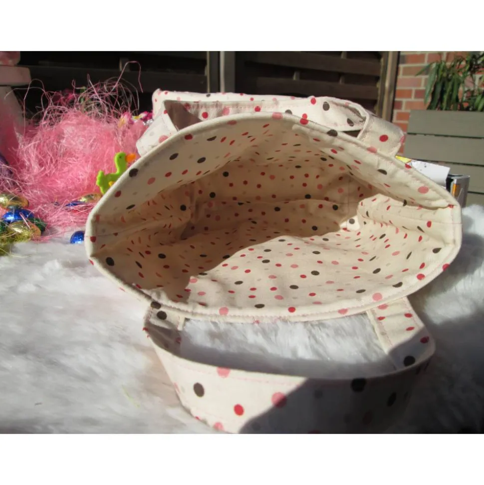 Das Täschchen ist aus Baumwollstoff genäht und zum bessern Stand mit Vlies gefüttert und verstärkt und kann gewendet werden.