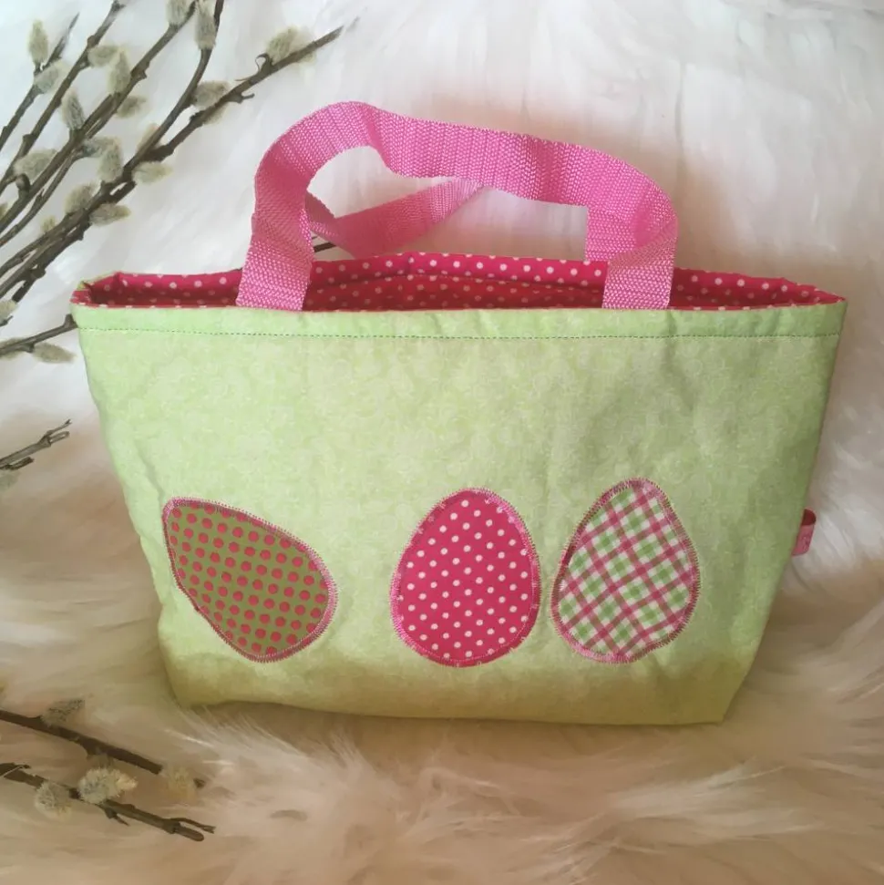 Verziert wurde das Ostertäschchen mit einer Applikation aus passenden Stoffen in Form von Ostereiern.