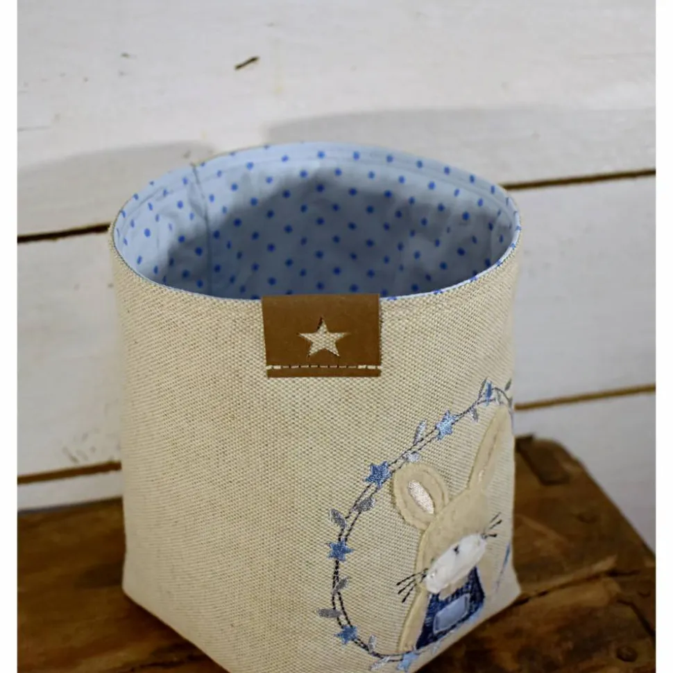 beigefarbener Osterkorb mit einer zauberhaften Hasenstickerei, in Blau/Grau gehalten. Geschmakvoll dekorieren in der Frühjahr- / Osterzeit, passend für viele Einrichtungsstile