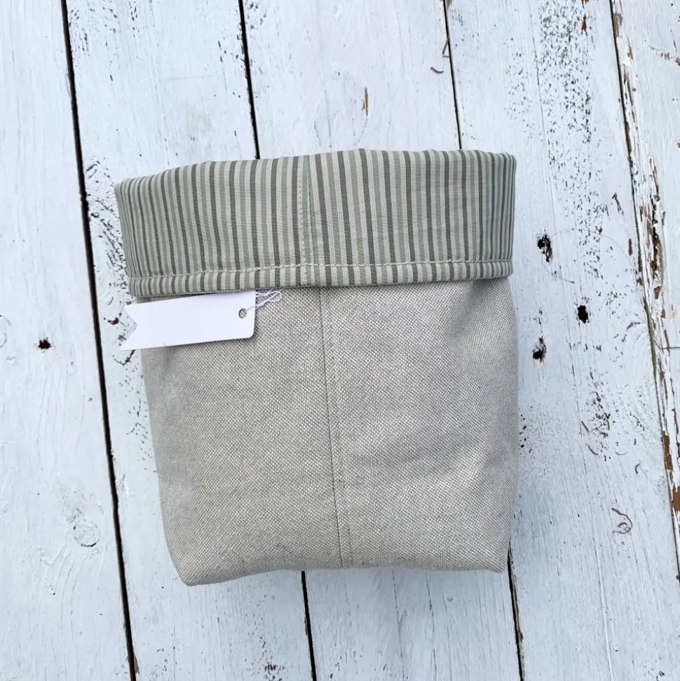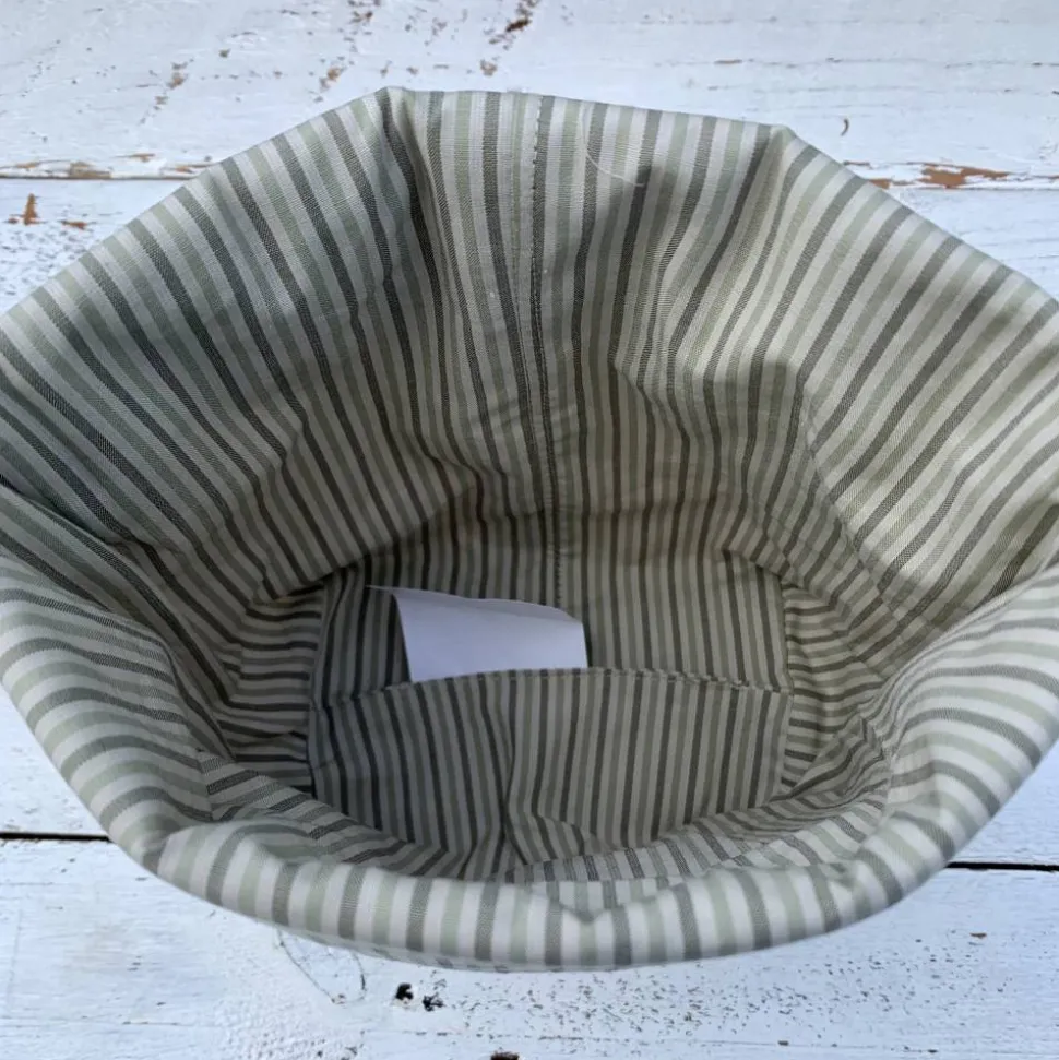 Der Korb ist außen aus hochwertigem, beigefarbenen und rustikalem Webstoff ( 100% Baumwolle ) gefertigt und innen mit einem glatten Baumwollstoff in einem gestreiften warmen Grün- und Beigetönen Innenstoff. Für zusätzliche Stabilität sorgt ein Volumenvlies. Die Maße betragen ca. 10 cm Tiefe, 23 cm einfache Breite und 23 cm Gesamthöhe . Das ovale Guckloch hat einen Durchmesser von ca. 12 x 10 cm.