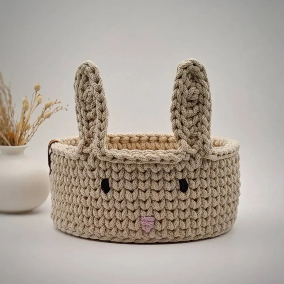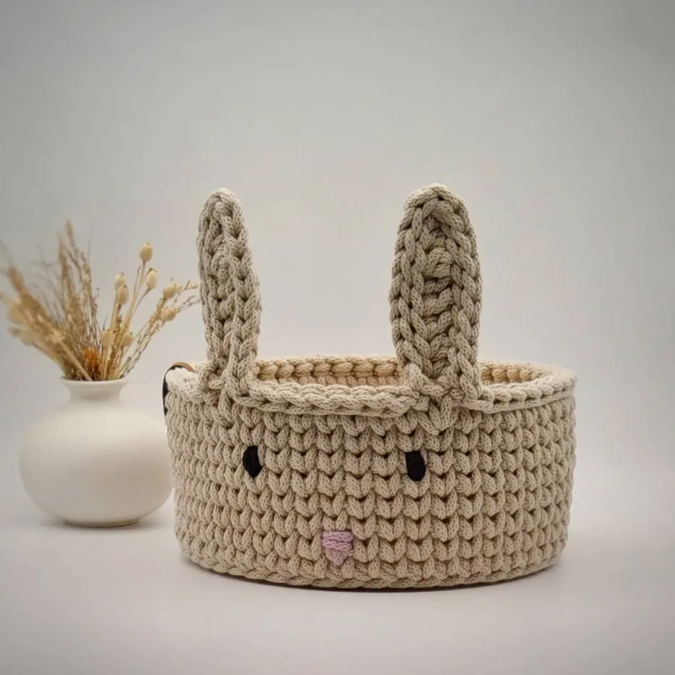 Osterkorb gehäkelt – mit Holzboden & Hasenohren, Ø 20 cm (Artikelnummer: K124):