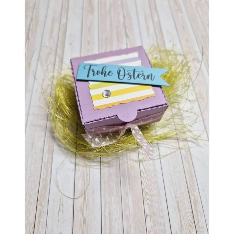 Verpacke ein schönes Teelicht in dieser zauberhaften Geschenkbox im österlichen Design. Die Box ist aus stabilem Farbkarton in lila ausgestanzt und gefaltet. Ein rosa Band rundet das liebevolle Design ab und die Dekoration ist schlicht österlich gehalten.