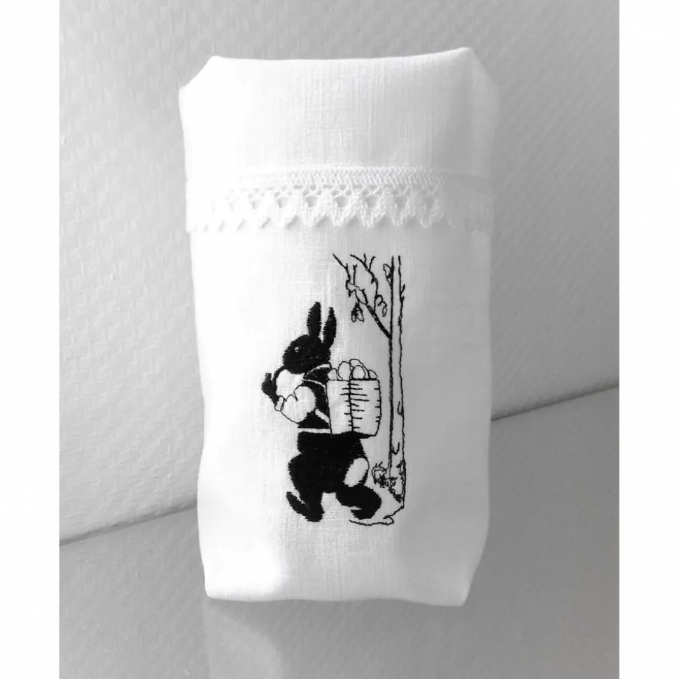 Der Lichtbeutel besteht aus 100% Leinen. Mit Baumwollspitze und bestickt mit einem Motiv von FeinKram ist der Beutel sehr edel.