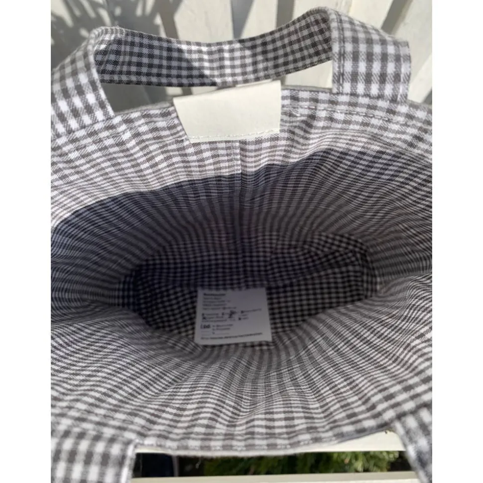 Die Tasche wurde von mir aus hochwertigem Baumwollstoff mit Digitaldruck in Betonoptik genäht, die Innenseite und Tragegriffe aus mittelgrauem kariertem Webstoff.