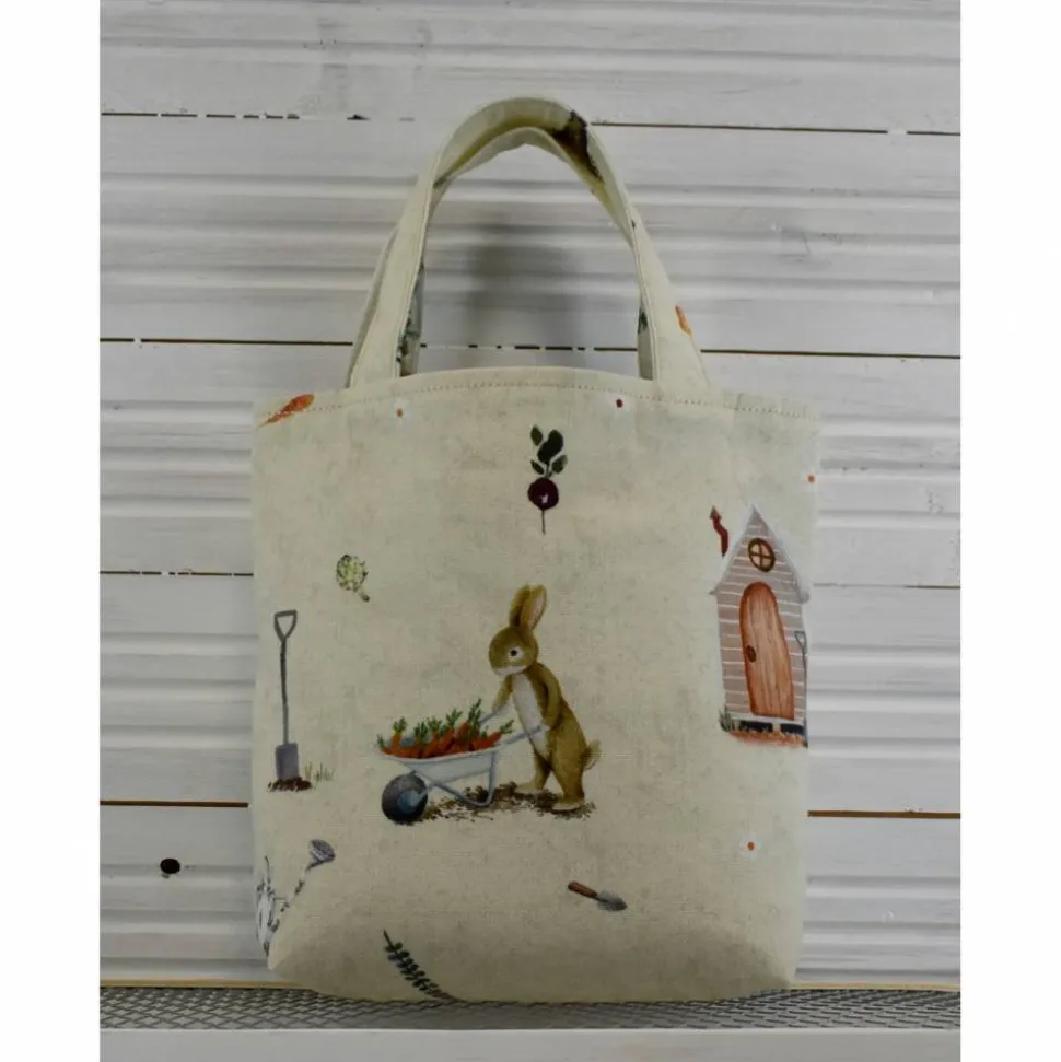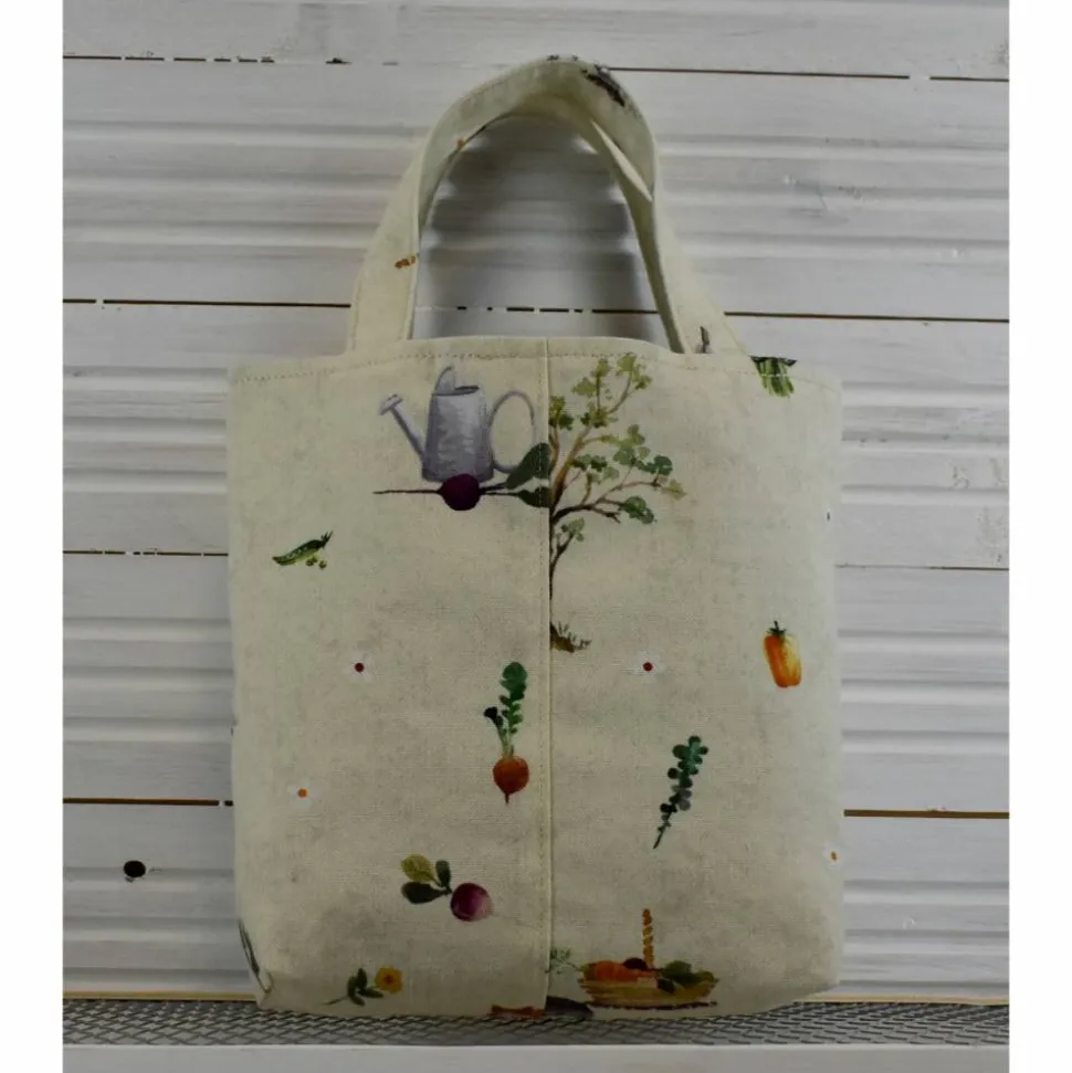 gelbgrüne marmorierte Tasche mit im Garten arbeitenden Tieren, wunderschön illustriert