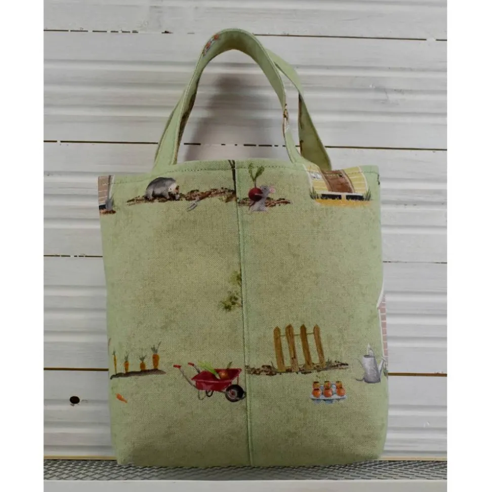hellgrüne marmorierte Tasche mit im Garten arbeitenden Tieren, wunderschön illustriert