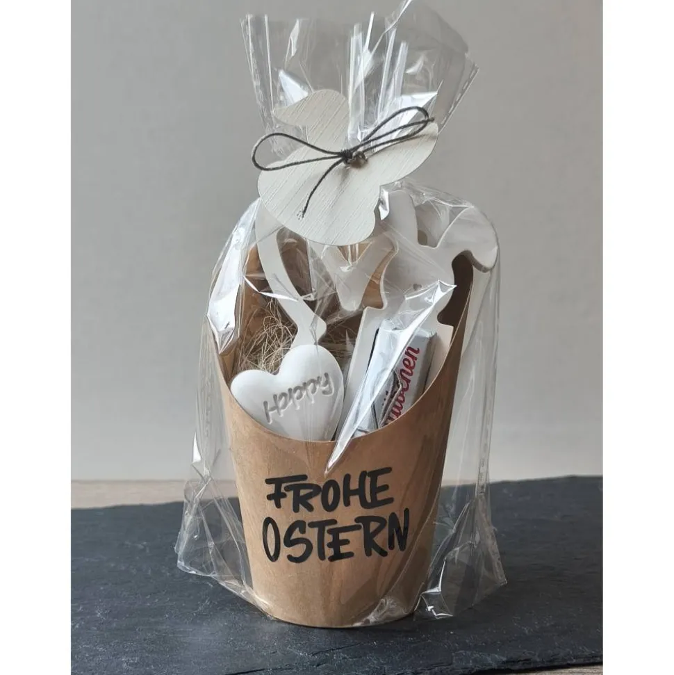 - Becher (12x6cm): Mit cremefarbener Holzwolle, Cellophanbeutel, Band & Geschenkanhänger.