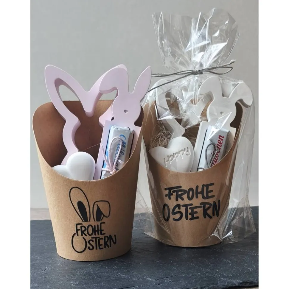 - Individuelles Becher-Design: Wähle zwischen süßem Hasen-Plott oder modernem Spruch.