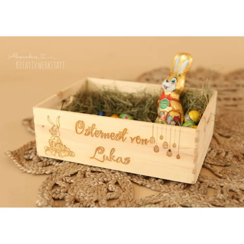 Ein tolles Osternest, dass die Kinder lieben werden. Die Kiste kann auch super für 2 Kinder genutzt werden. Ob beide Namen auf einer Seite stehen oder eine Seite für das eine Kind und die andere Seite für das andere Kind könnt ihr alleine entscheiden. Die Kiste kann jederzeit individuell gestaltet werden sollte Euch das Beispiel nicht 100% zusagen.