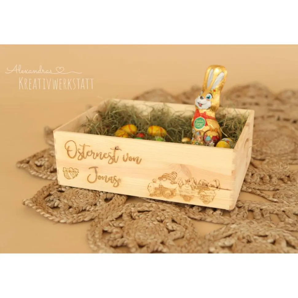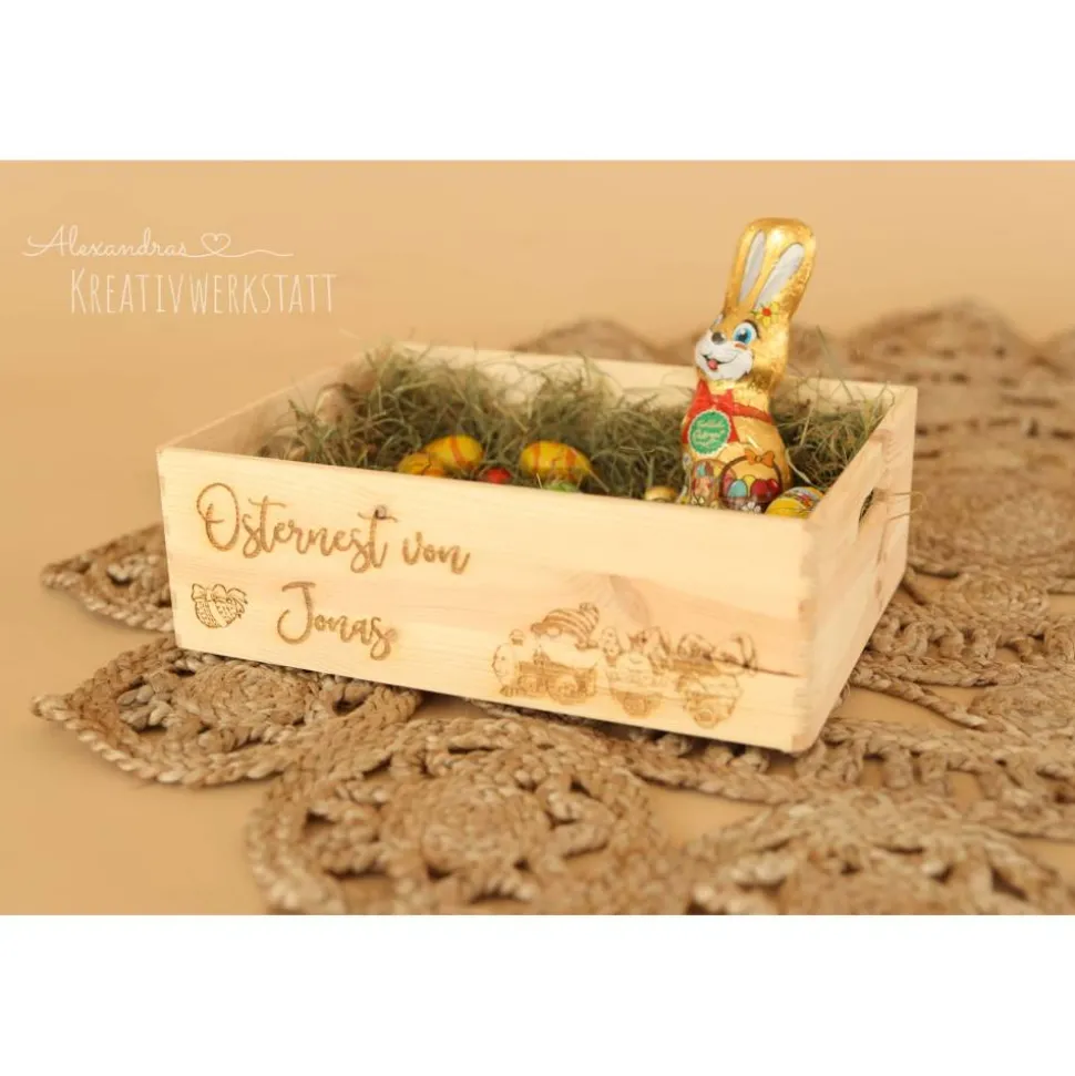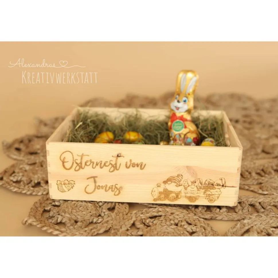 Ein tolles Osternest, dass die Kinder lieben werden. Die Kiste kann auch super für 2 Kinder genutzt werden. Ob beide Namen auf einer Seite stehen oder eine Seite für das eine Kind und die andere Seite für das andere Kind könnt ihr alleine entscheiden. Die Kiste kann jederzeit individuell gestaltet werden sollte Euch das Beispiel nicht 100% zusagen.