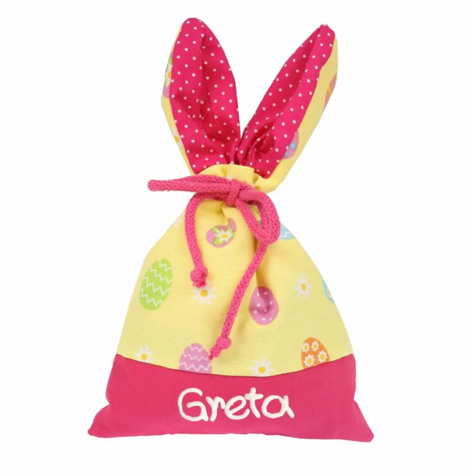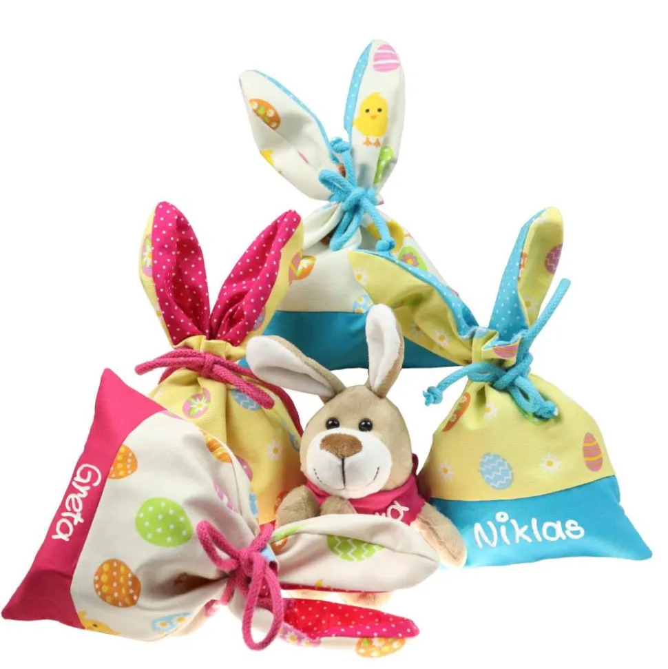 Es muss nicht immer das Osternest sein. Kinder freuen sich auch über einen Säckchen mit lustigen Hasenohren. Fülle es mit Schokoladeneiern und verstecke es. Durch die Beschriftung mit Name kann es nicht verwechselt werden.