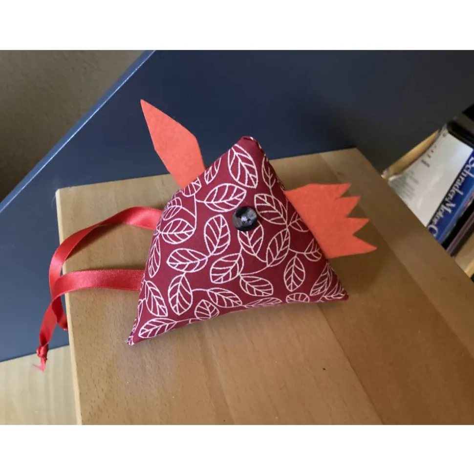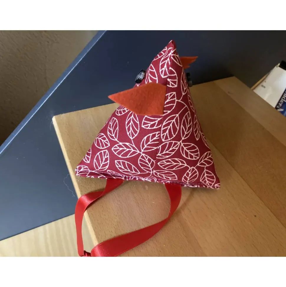 Die Hühnchen sind aus dem gleichen Stoff in unterschiedlichen Größen und Farbstellungen genäht. Die sog. Dreieckshühnchen sind so gestaltet, dass sie gut sitzen und auch als „Kantenhocker“ geeignet sind. Kamm und Schnabel sind aus hellrotem oder gelbem Filz, die langen Beine aus rotem Deko-Band und die Augen als kleine passende Knöpfe aufgenäht. Füllstoff bei allen drei Teilen ist Bastelwatte aus Recycling-Material.