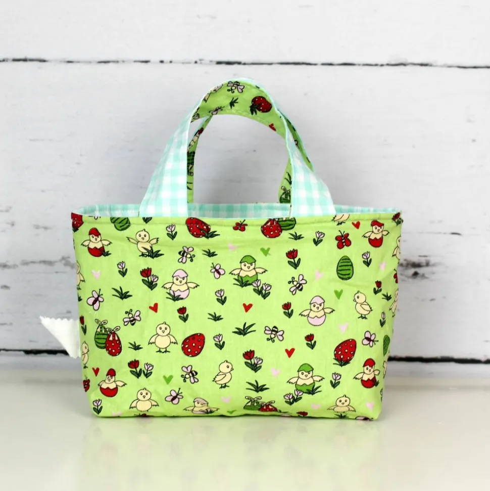 Die mint/weiß karierte Seite aus Baumwollstoff wurde mit einer Hasen Applikation aus Filz verziert. Wird das Täschchen umgestülpt kommt der grüne Stoff mit den Küken, Ostereiern und Blumen zur Geltung.