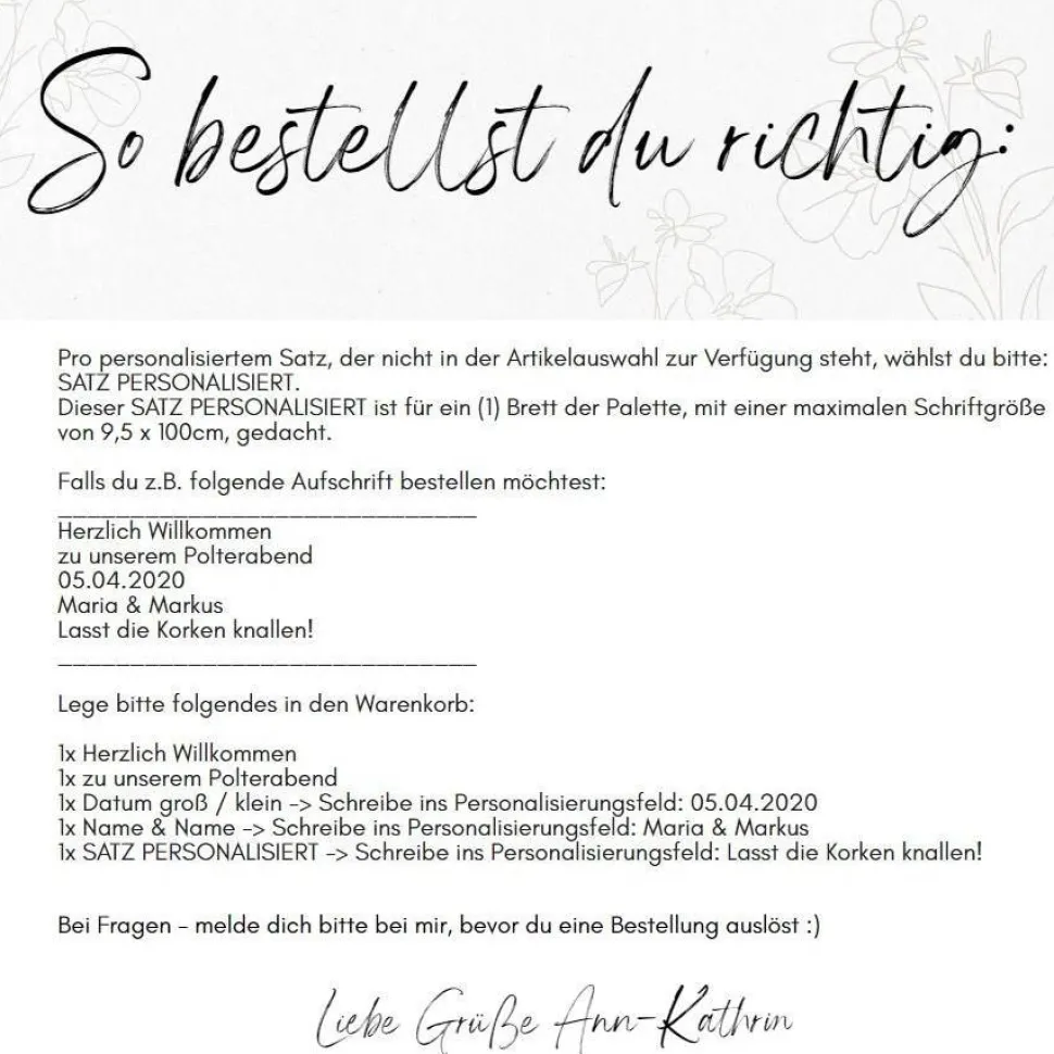Dieses BRETT PERSONALISIERT ist für ein (1) Brett der Palette, mit einer maximalen Schriftgröße von 9,5 x 100cm, gedacht.