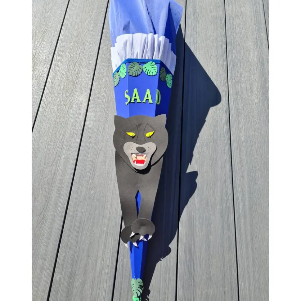 Im Dschungel treibt sich ein gefährliches Tier herum, der Panther. Auf der Schultüte kommt er friedlich rüber und Kinder mögen ihn weil er so kuschelig ist.