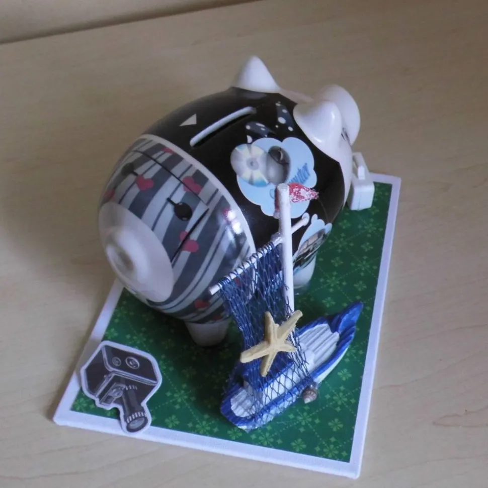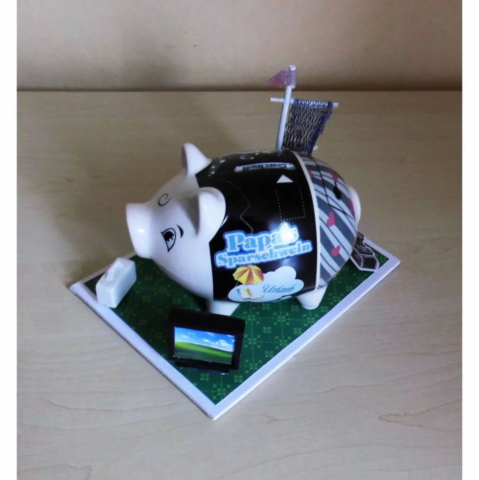 Papa´s Sparschwein ist das perfekte Geschenk für deinen Vater oder Mann! Dieses lustige Geldgeschenk setzt die Träume eines Papas kreativ in Szene: Urlaub, Auto, Computer sowie zusätzliche Symbole wie Boot, Kamera, Reisekoffer und PC-Monitor schmücken das Sparschwein. Das macht es zu einem originellen Highlight für Technikfans und Träumer.