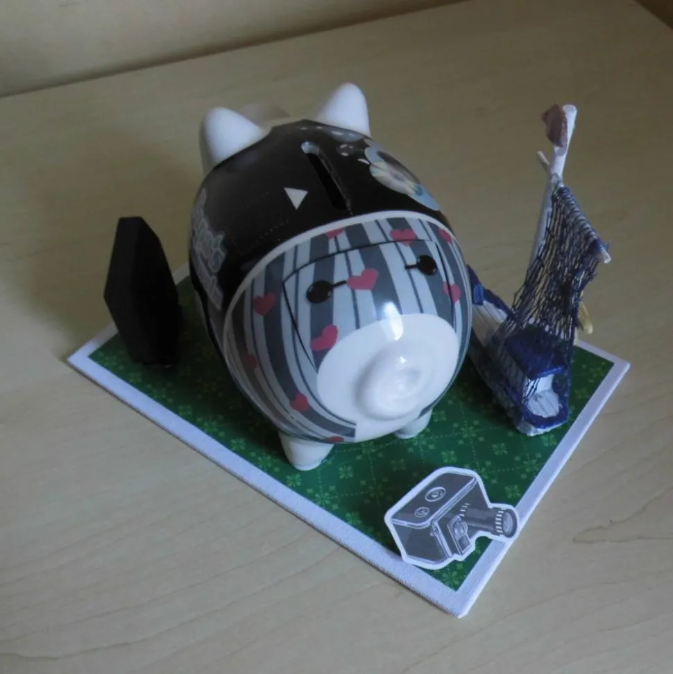 Das Sparschwein ist fest auf eine Platte mit den Maßen 13 x 18 cm geklebt. Du kannst das Sparschwein ganz einfach von der Platte lösen. Am Bauch befindet sich ein Gummipfropfen, sodass du das Ersparte bequem entnehmen kannst.