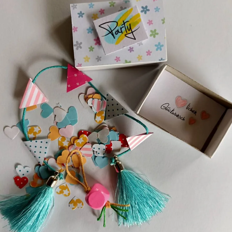 In der Streichholzschachtel befindet sich eine Minigirlande mit Püschel an den Enden und einem Glücksbringer, abgerundet wird das ganze mit Konfetti in ausgestanzten Herzen, Kleeblättern und Sternen. Der Inhalt variiert in der Farbgebung und Glücksbringerform, ist aber immer geschmacklich aufeinander abgestimmt.