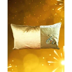 Dieses handgemachte Kissen bringt Teddy-Fans garantiert zum Strahlen! Auf der einen Seite ein glänzender Cordstoff, auf der anderen ein feiner brauner Cordstoff mit aufgesticktem Teddy im Patchwork-Stile – ein echtes Highlight!