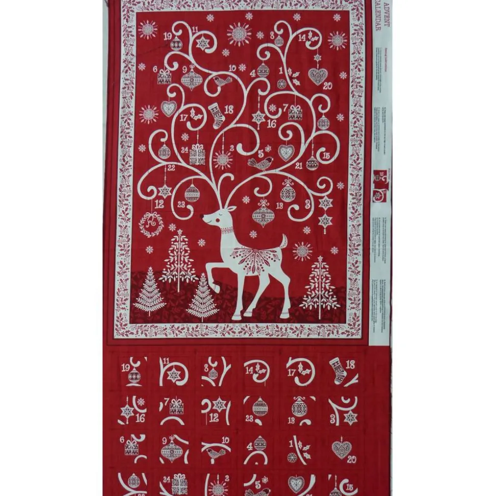 Jetzt schon an Weihnachten denken. Dieser Adventskalender von Makower ist im klassischen Weihnachtsrot und besonders elegant. Er ist schnell genäht, eine Anleitung in Englisch befindet sich am Rand des Panel. Man muss nicht unbedingt die englische Sprache beherrschen um die Anleitung zu verstehen. Er ist zugleich auch ein schöner Wandbehang in der Vorweihnachtszeit. Der fertige Adventskalender hat eine Größe von ca. 53 cm x 75 cm.