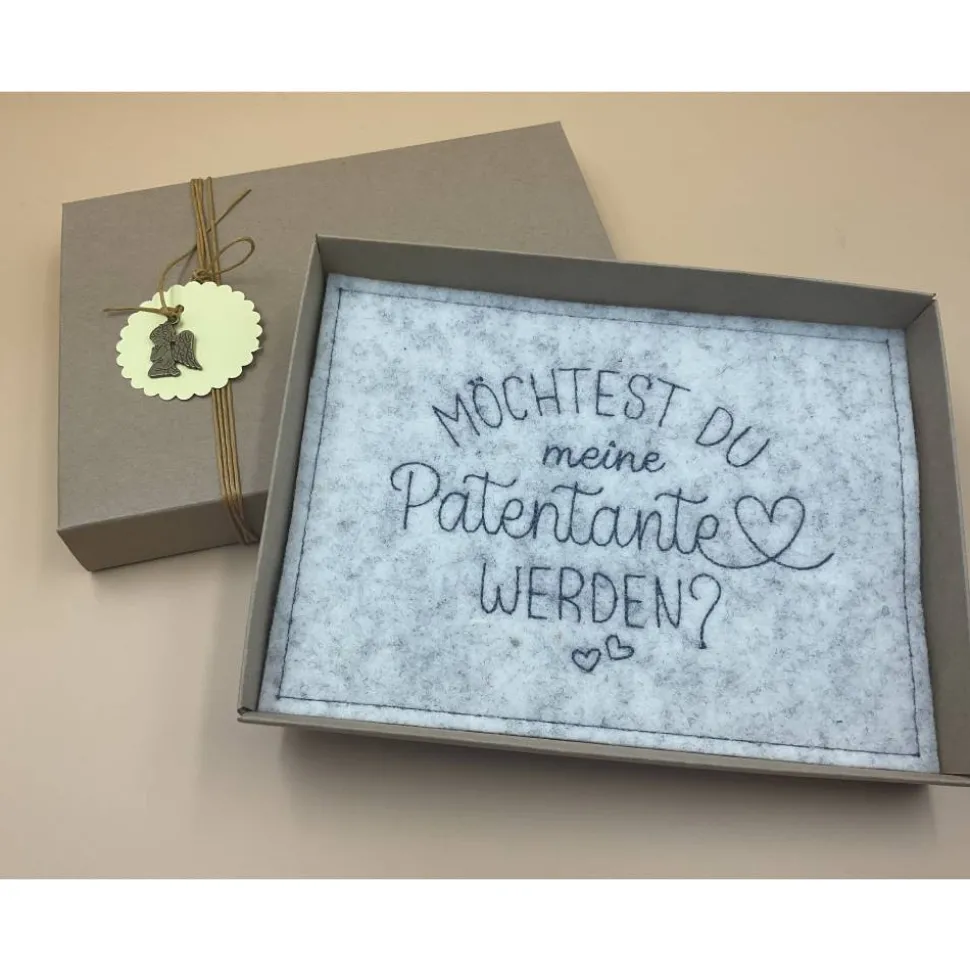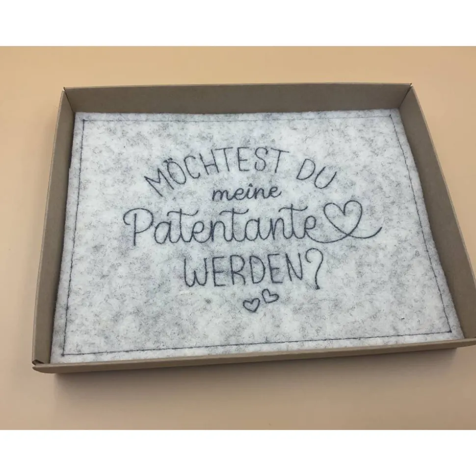 Im Inneren eine bestickte Filzkarte mit dem Text „willst du meine Patentante sein?“