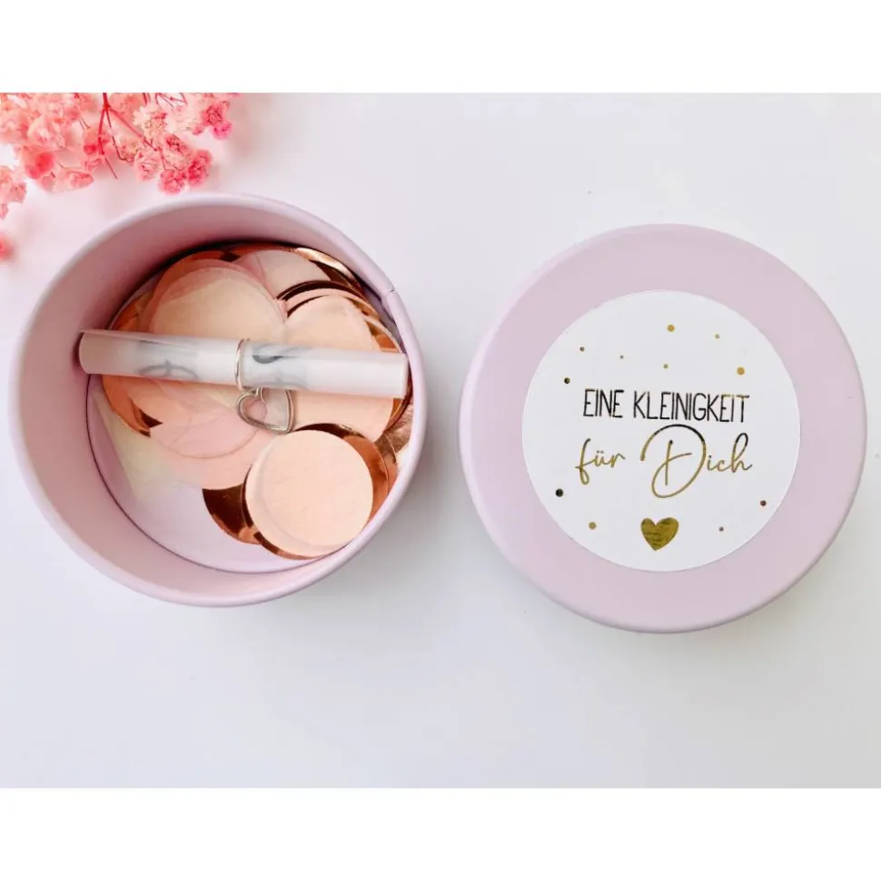 In der rosafarbenen Geschenkbox befindet sich hochwertiges Konfetti und eine Schriftrolle an der ein Herz Anhänger angebracht wurde. Die Frage: