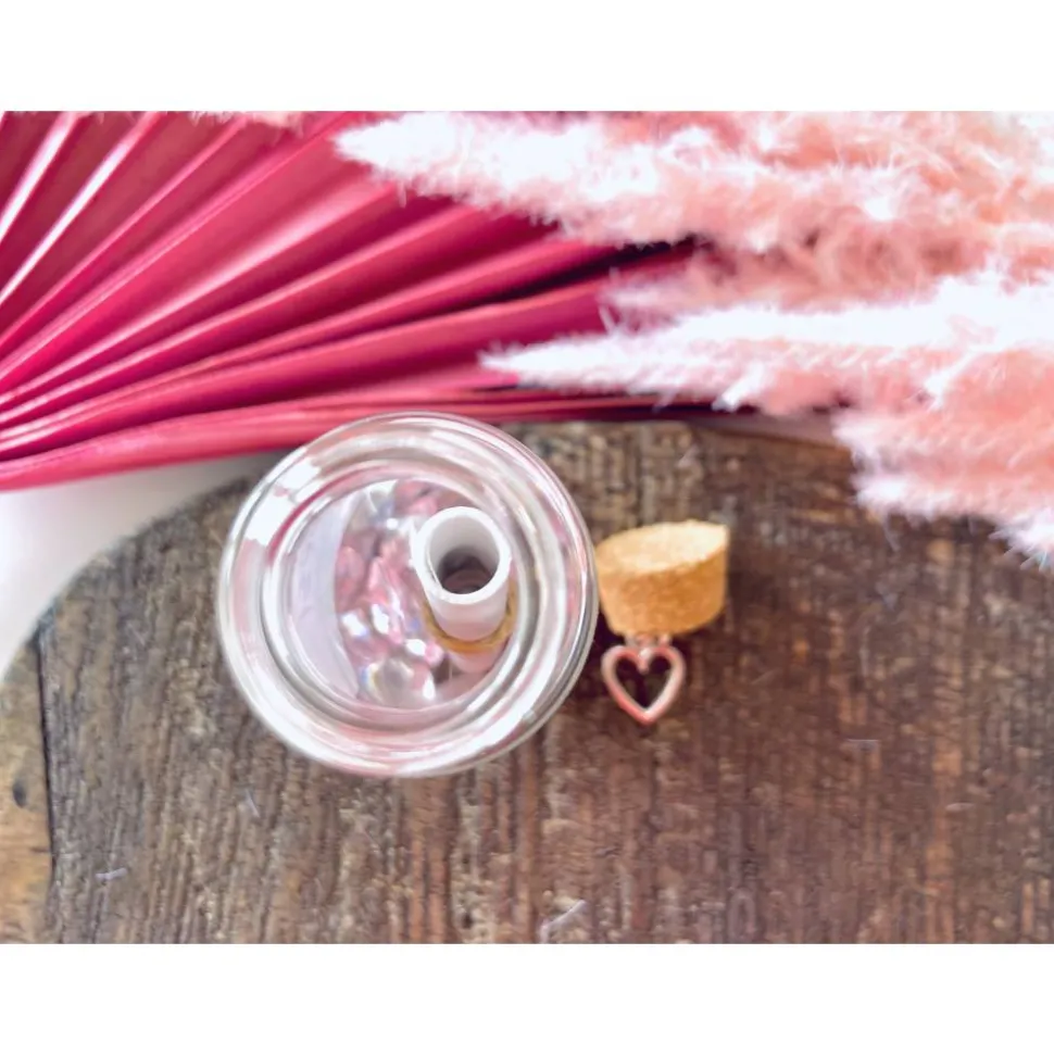 Sie ist aus Glas und hat einen Korkverschluss in dem ein kleiner Herzanhänger steckt.