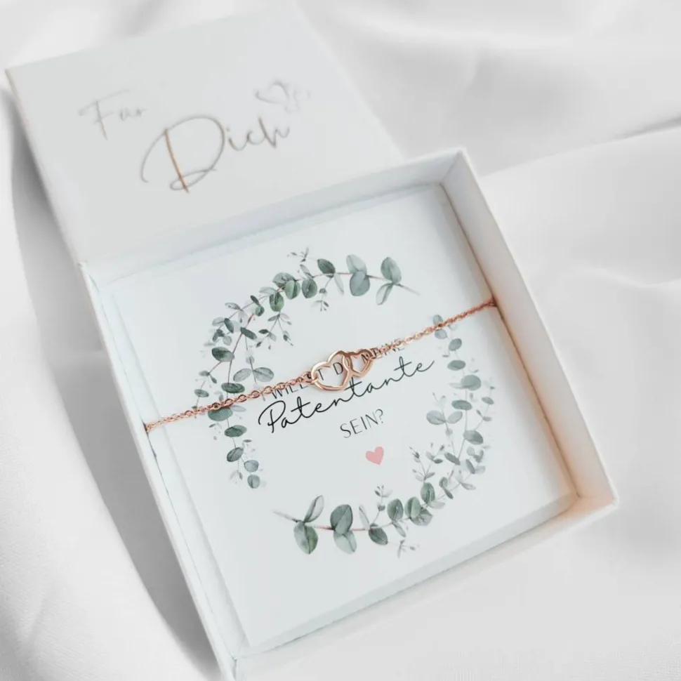 Dieses einzigartige Armband mit den zwei verbundenen Herzen wird deiner Freundin ein strahlendes Lächeln auf die Lippen zaubern. Die zwei Herzen stehen für das Patenkind und die zukünftige Patentante