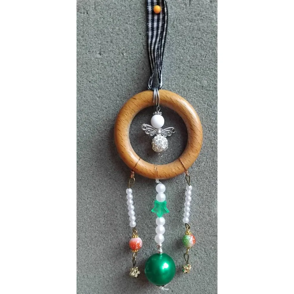 Entdecke den zauberhaften Perlenengel im Holzring – ein handgefertigtes Unikat, das deinen Weihnachtsbaum oder dein Fenster stilvoll schmückt. Der Holzring hat einen Durchmesser von ca 5cm und trägt einen zarten Engel mit Tonperle, liebevoll bestückt mit funkelnden Steinchen.
