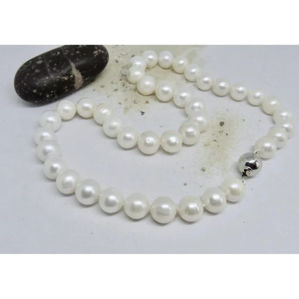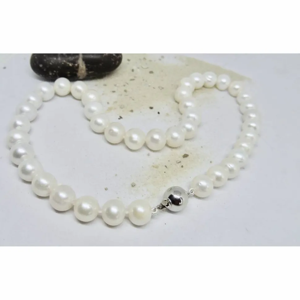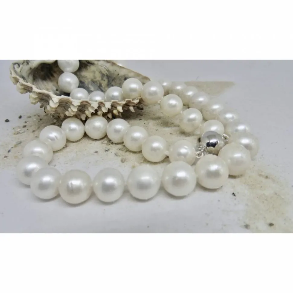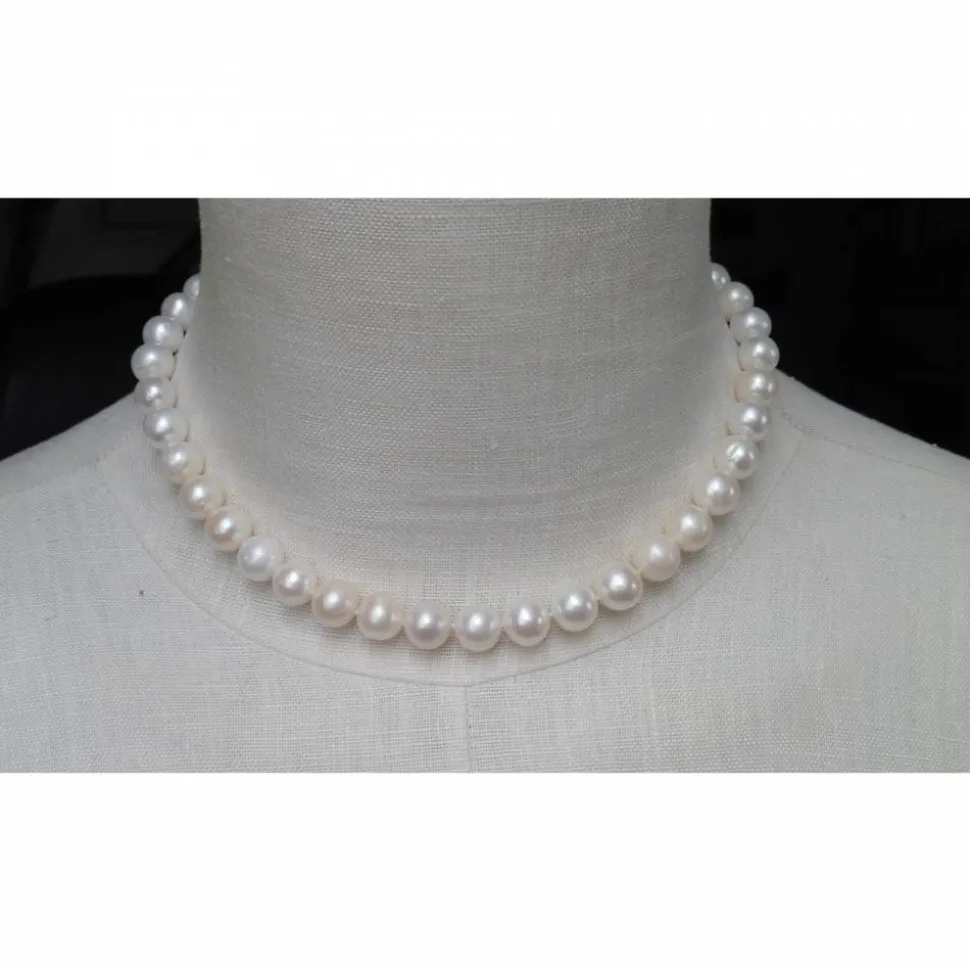 Diese wunderschöne Perlenkette in gleichmäßiger Größe und Choker-Länge darf als Klassiker im Schmuckkästchen nie fehlen. Diese echten Süßwasserperlen haben eine sehr gute Qualität (AA), wunderbaren seidigen Glanz, runde Form. Die insgesamt sehr gute Haut enthält manchmal kleine Fehler, die auf den Photos gut sichtbar sind. Die Form ist rund mit minimalen Abweichungen. Die Fotos sind nicht retuschiert, manchmal sind kleine Sandkörner zu sehen.