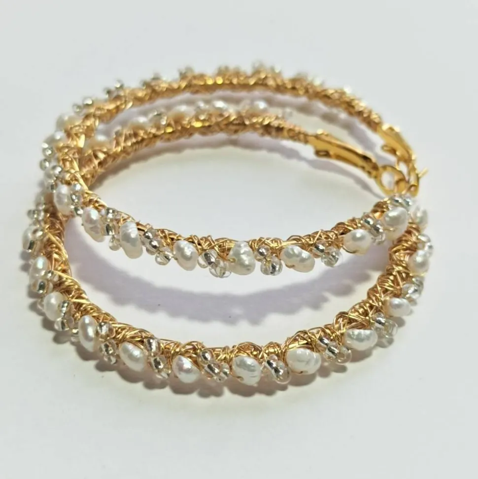 Maße Perlen 4 x 2 Millimeter, Roccailles 2 mm, Durchmesser der Creole innen 50 Millimeter, aussen mit den Perlen etwa 55 Millimeter, Länge der Ohrringe 52Millimeter. Für die Ohrringe wurden verwendet Süßwasserzuchtperlen weiß, Schmuckmetall goldfarben. Die Creolen als Perlenohrringe mit Klappscharnier sind einfach anzulegen und angenehm zu tragen.
