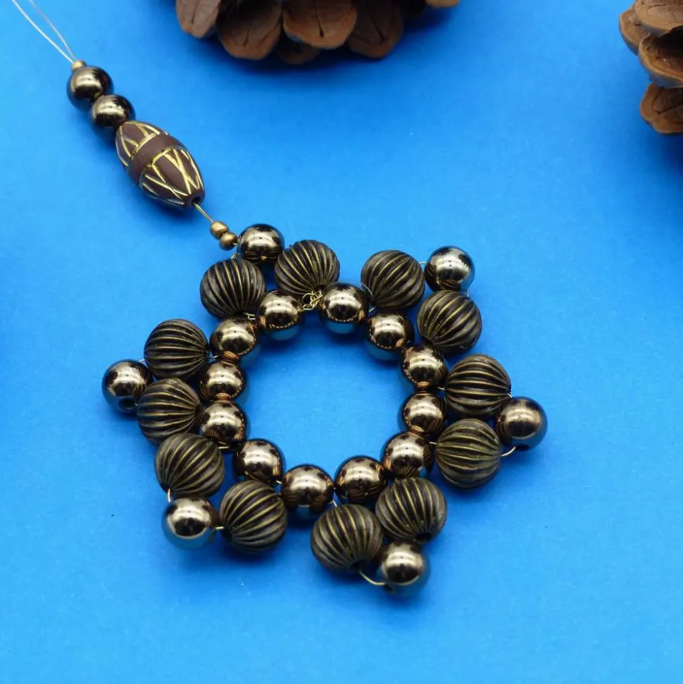 Mit diesem liebevoll handgefertigten Stern aus Glasperlen, Glaswachsperlen und Metallperlen holst du dir einen echten Blickfang in deine Weihnachtsdekoration. Der Stern wurde auf goldfarbenem Schmuckdraht gefädelt und überzeugt durch glänzende sowie matte Elemente in den Farben braun, bronze und gold.