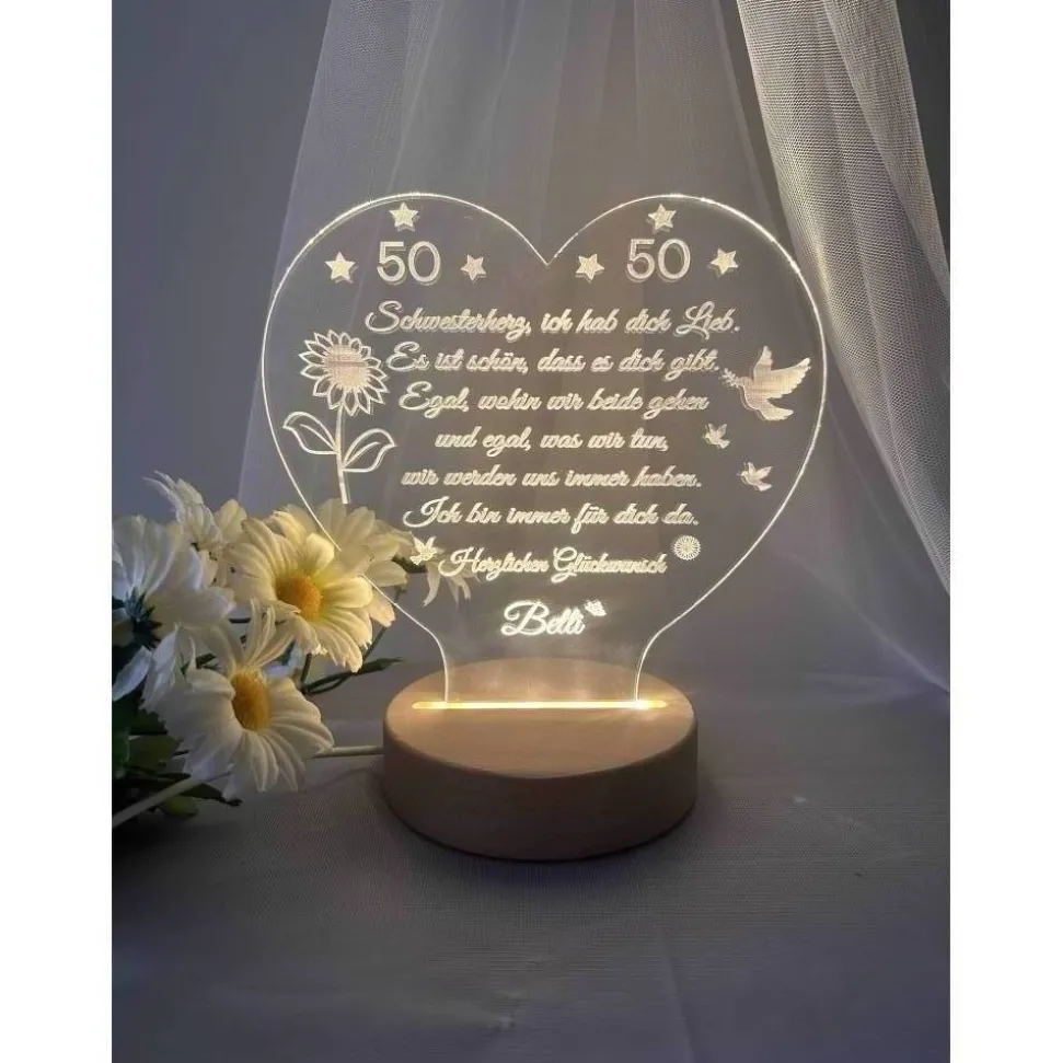 ist das perfekte Geschenk für Freunde und Familie. Die moderne 3D-Lampe wird mit einem Holz-Sockel geliefert und ist mit einer warmweißen LED-Beleuchtung ausgestattet. Sie ist aus Acryl gefertigt und kann über eine USB-Stromversorgung betrieben werden. Besonders schön ist die Gravur, die nach Wunsch mit einem individuellen Namen oder Spruch personalisiert werden kann. Die Herzlampe eignet sich für alle Zimmer und ist ein Blickfang im Wohnzimmer, Schlafzimmer oder auch im Arbeitszimmer.