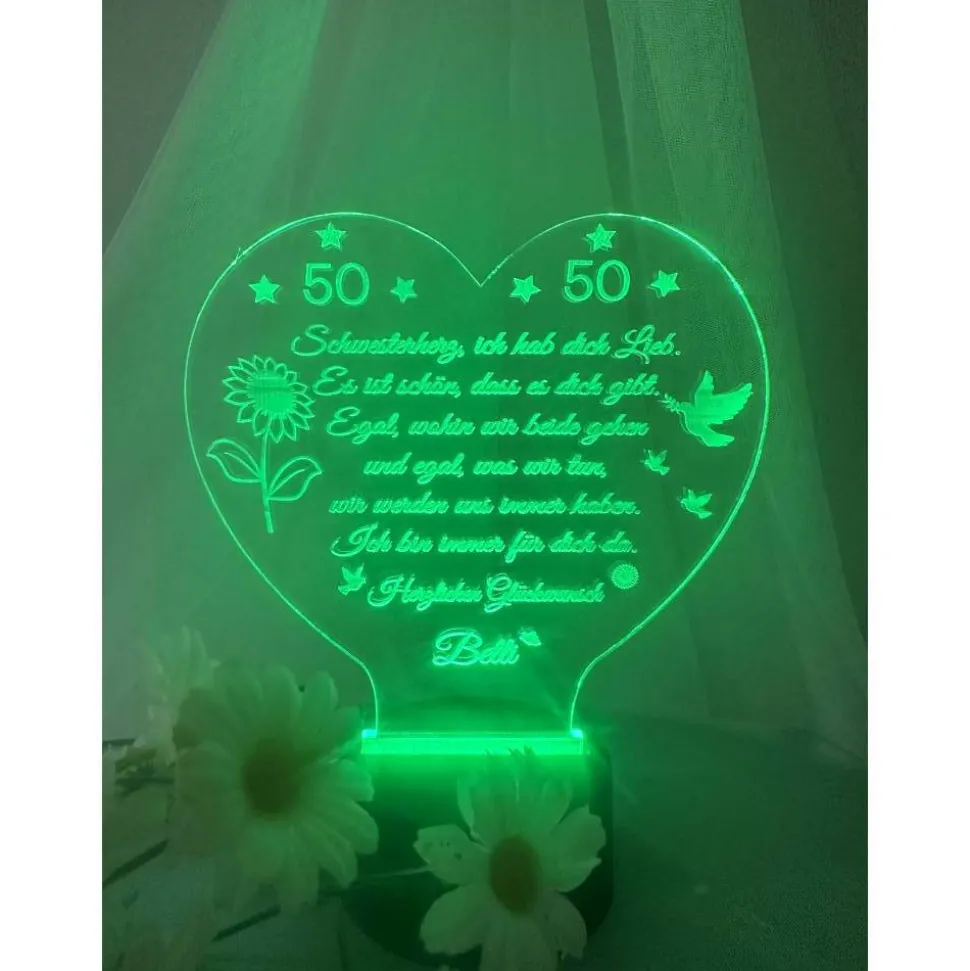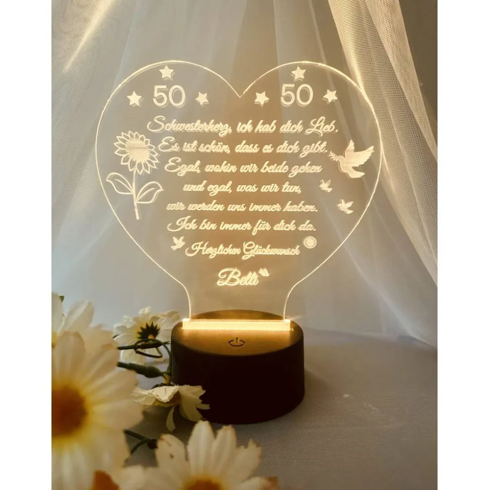ist das perfekte Geschenk für Freunde und Familie. Die moderne 3D-Lampe wird mit einem Holz-Sockel geliefert und ist mit einer warmweißen LED-Beleuchtung ausgestattet. Sie ist aus Acryl gefertigt und kann über eine USB-Stromversorgung betrieben werden. Besonders schön ist die Gravur, die nach Wunsch mit einem individuellen Namen oder Spruch personalisiert werden kann. Die Herzlampe eignet sich für alle Zimmer und ist ein Blickfang im Wohnzimmer, Schlafzimmer oder auch im Arbeitszimmer.