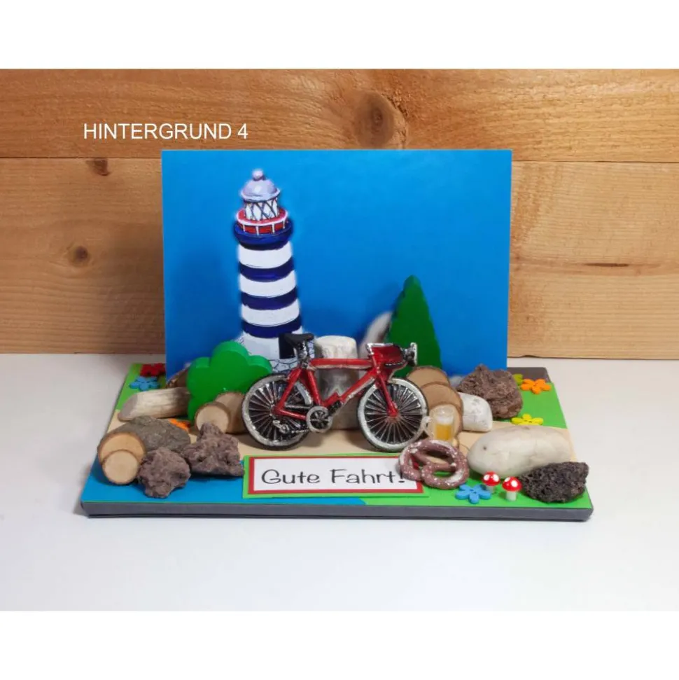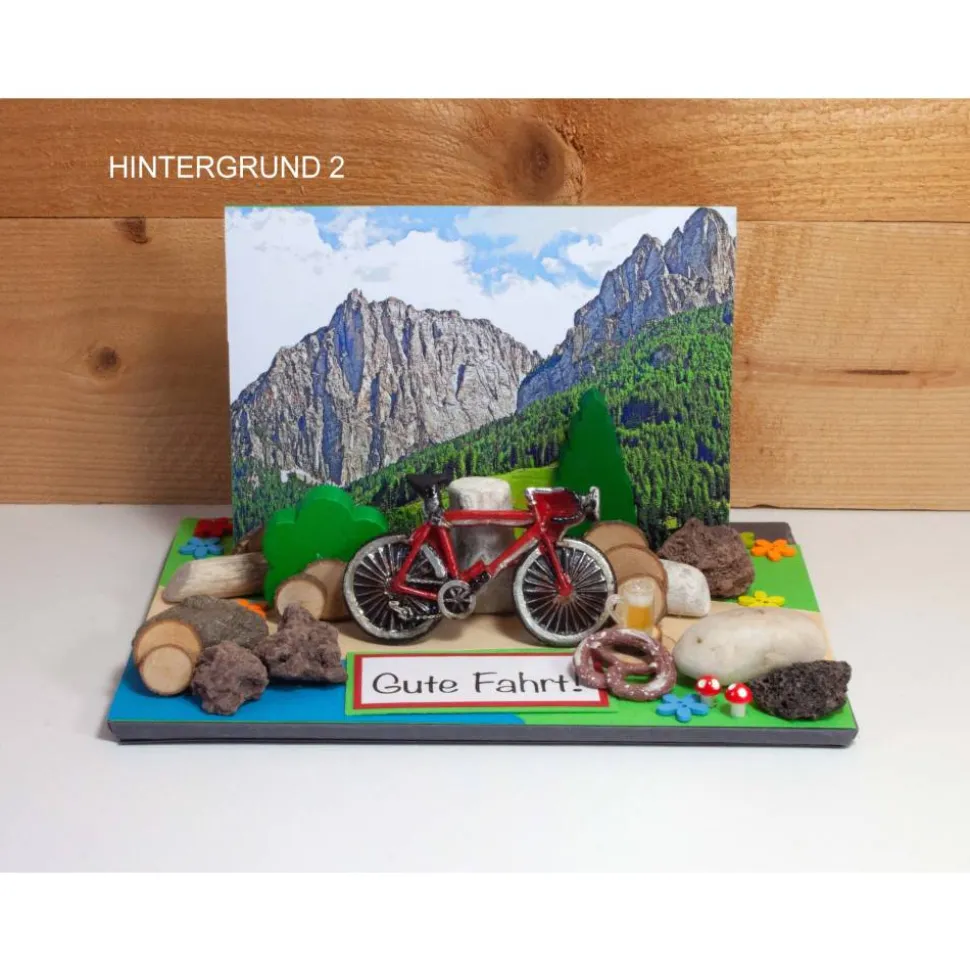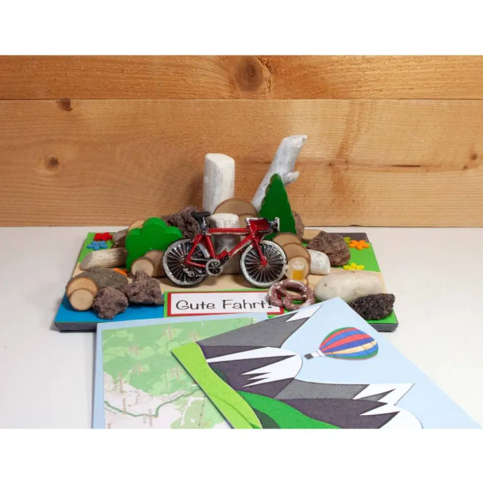 Geschäumte Pappe, Fotokarton, Rad Polyresin, Umschlag + Karte C6, Lavasteine, Steine, Streublümchen, Treibholz, Pilze Holz, Baum Holz, Brotzeitutensilien Kunststoff.