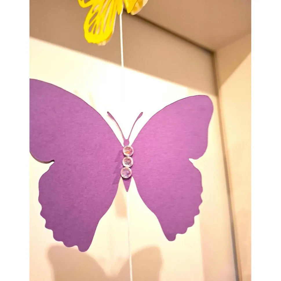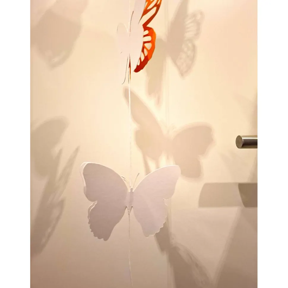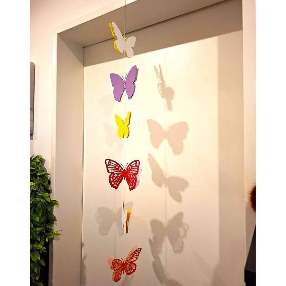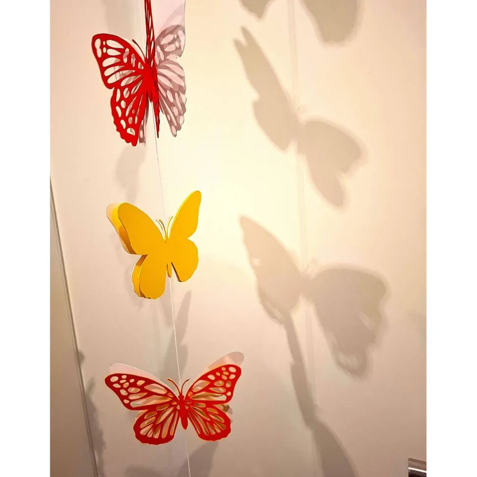 Eine Zarte, farbenfrohe Schmetterlings – Girlande, die jedem Raum sofort Leichtigkeit und Frühlingsstimmung verleiht. Die einzelnen Schmetterlinge werden aus hochwertigem 300 GSM Farbkarton gefertigt, doppellagig gearbeitet und dadurch besonders stabil und plastisch. Zwischen jedem Element verläuft ein feiner Wachsfaden , der die Schmetterlinge elegant miteinander verbindet.