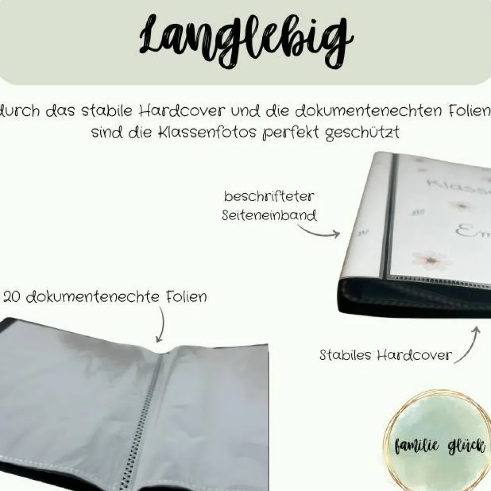 Ob als Geschenk zur Einschulung oder als praktische Lösung für die geordnete Aufbewahrung von Schulfotos – dieses Schulfotoalbum ist vielseitig einsetzbar und überzeugt durch Qualität und Stil.