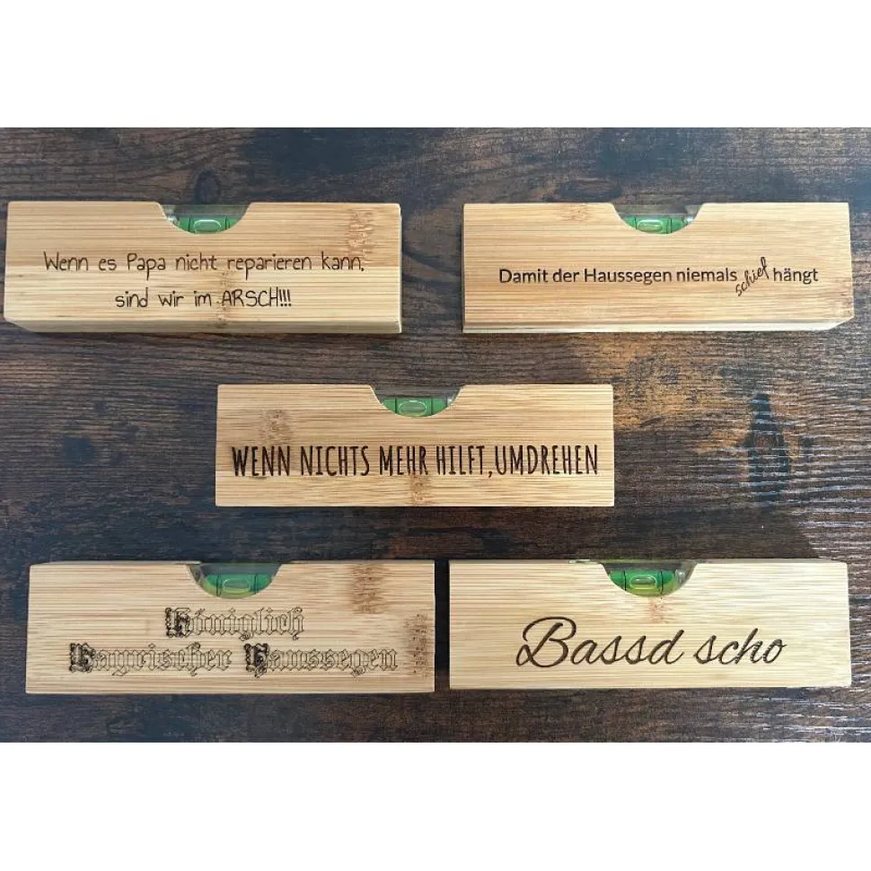 Hochwertiges Material: Die Wasserwaage besteht aus massivem Bambus, einem schnell nachwachsenden Rohstoff, der nicht nur umweltfreundlich, sondern auch widerstandsfähiger als viele Weichhölzer ist. Die Oberfläche ist glatt geschliffen und die Gravur wird per Laser dauerhaft eingebrannt. Keine aufgeklebten Folien, sondern echte Wertarbeit!