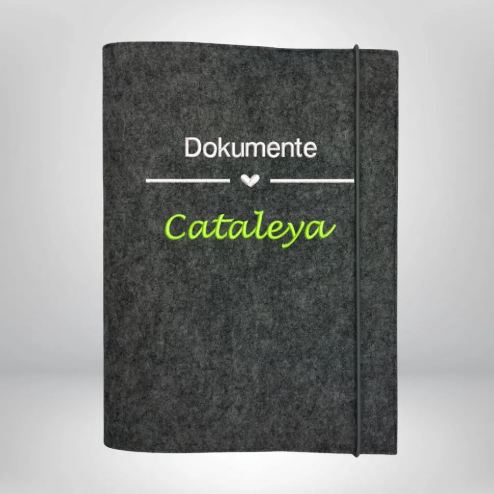 Entdecke deine personalisierte Dokumentenmappe aus hochwertigem Designfilz! Diese handgefertigte Mappe vom Bodensee vereint stilvolle Stickerei mit deinem Wunschnamen und praktische Aufbewahrung. Der robuste Einband besteht aus 100% Polyester in der Farbe anthrazit meliert. Die Stickfarbe für den Namen wählst du ganz nach deinem Geschmack. Ein sicherer Elastikkordelverschluss sorgt für einen festen Halt.